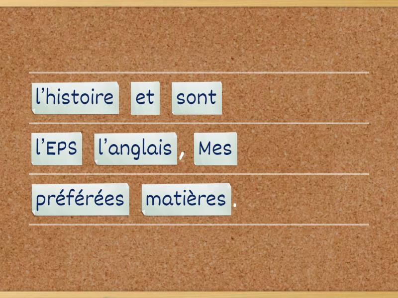 Mes matières préférées sont l’histoire, l’EPS et l’anglais., J'adore l'EPS c'est passionnant,, pourtant je déteste l'EPS avec M. Dupont., Il est trop sévère! ,