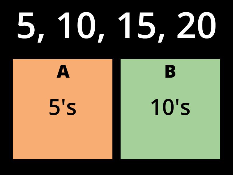 1) 5, 10, 15, 20 a) 5's b) 10's 2) 20, 25, 30, 35 a) 5's b) 10's 3) 35, 40, 45, 50 a) 5's b) 10's 4) 50, 55, 60, 65 a) 5's b) 10's 5) 65, 70, 75, 80 a) 5's b) 10's 6) 80, 85, 90, 95 a) 5's b) 10's 7) 95, 100, 105, 110 a) 5's b) 10's 8) 10, 15, 20, 25 a) 5's b) 10's 9) 10, 20, 30, 40 a) 5's b) 10's 10) 25, 30, 35, 40 a) 5's b) 10's 11) 40, 45, 50, 55 a) 5's b) 10's 12) 40, 50, 60, 70 a) 5's b) 10's 13) 50, 60, 70, 80 a) 5's b) 10's 14) 70, 80, 90, 100 a) 5's b) 10's 15) 100, 110, 120, 130 a) 5's b) 10's 16) 20, 30, 40, 50 a) 5's b) 10's 17) 80, 90, 100, 110 a) 5's b) 10's 18) 30, 40, 50, 60 a) 5's b) 10's 19) 60, 70, 80, 90 a) 5's b) 10's 20) 90, 100, 110, 120 a) 5's b) 10's