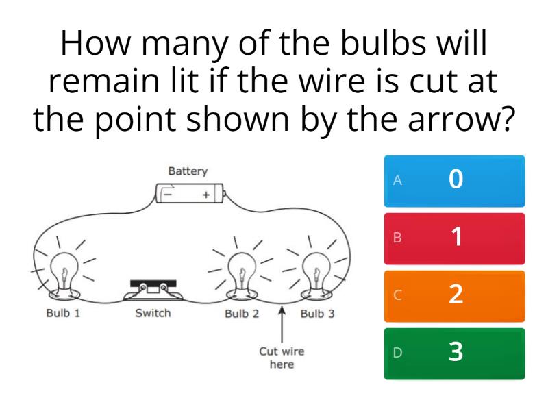 1) How many of the bulbs will remain lit if the wire is cut at the point shown by the arrow? a) 0 b) 1 c) 2 d) 3 2) Which of these changes will cause the light bulb to light up? a) Straightening the wire b) Add a switch c) Turn one battery d) Make the length of wire the same on both sides 3) When the lights are on, electricity travels in- a) a complete circuit b) a sound wave c) a light ray d) an incomplete path 4) The lightbulb does not glow. Which statement explains this observation? a) The battery is not charged. b) The lightbulb is not part of a complete circuit. c) The circuit does not have a switch. d) The bell uses most of the energy from the battery. 5) To recharge the battery without lighting the bulb, which switches should be closed? a) Switch S only b) Switches R and S only c) Switches R and T only d) Switches R, S, and T 6) All bulbs are lit. Which change would cause all the bulbs to go out? a) Removing Wire 1 b) Removing Wires 2 and 4 c) Removing Wires 2 and 5 d) Removing Wires 3 and 4 7) What will happen if Switch 3 is closed and the other switches are left open? a) Only the white bulb will operate. b) None of the bulbs will operate. c) Only the white and yellow bulbs will operate. d) Only the red and blue bulbs will operate. 8) Which procedure will result in only the blue lightbulbs operating? a) Close Switches 1 and 2 and leave Switch 3 open b) Close Switch 3 and leave switches 1 and 2 open c) Close Switches 2 and 3 and leave Switch 1 open d) Close Switch 2 and leave switches 1 and 3 open 9) When the student connects the wires as shown, which of the bells will ring? a) Bell 1 only b) Bells 1 and 4 only c) Bells 3 and 4 only d) Bells 1, 2, 3, and 4 10) In which of these will the other lightbulbs still light even if one bulb is burned out? a) b) c) d)
