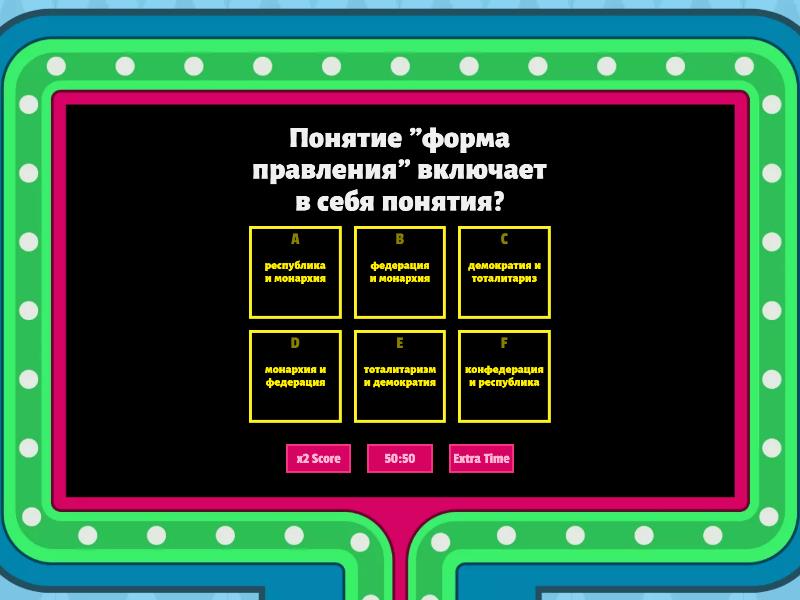 1) Понятие "форма правления" включает в себя понятия? a) республика и монархия b) федерация и монархия c) демократия и тоталитариз d) монархия и федерация e) тоталитаризм и демократия f) конфедерация и республика 2) Государство А. обладает единой законодательной, исполнительной и судебной властью, издаёт законы, которые действуют на его территории. В каждой провинции, входящей в состав государства, существуют свои властные органы, конституции и законы. Какова форма государственно-территориального устройства государства М.? a) федерация b) конфедерация c) унитарное государство d) светское государство e) разделение властей f) республика 3) В государстве К. всенародно избираемый президент одновременно является главой государства и главой правительства. При этом ответственность за свои действия правительство несёт перед президентом. Какова форма правления государства К.? a) конституционная монархия b) президентская республика c) смешанная республика d) парламентская республика e) абсолютная монархия f) дуалистическая монархия 4) В государстве С. перед парламентом несёт правительство, которое формируется за счёт представителей партий, набравших большинство голосов в процессе выборов. Президент страны избирается парламентом. Какова форма правления государства С.? a) президентская республика b) конституционная монархия c) парламентская республика d) абсолютная монархия e) дуалистическая монархия f) смешанная республика 5) Что не относится к политическим режимам? a) тоталитаризм b) демократия c) авторитаризм d) либерализм 6) Что характерно для унитарного государства? a) действие в субъектах собственных законов b) одноканальная система налогов c) двухпалатный парламент d) разграничение предметов ведения центра и регионов 7) Форма правления, которой монарх «царствует, но не правит» a) абсолютная монархия b) ограниченная монархия c) парламентская республика d) президентская республика e) смешанная республика f) дуалистическая монархия 8) Тоталитарный режим отличает a) наличие государственного аппарата b) гарантия прав и свобод граждан c) деятельность свободной прессы d) всесторонний контроль государства над жизнью общества e) независимость СМИ 9) Союз самостоятельных государств («государственный союз государств» ), которые объединяются для решения общих задач (экономических, оборонительных и т.д.), но без создания единого государства это? a) федерация b) республика c) конфедерация d) демократия 10) В стране Z существует Конституция, декларирующая право граждан на собрания, митинги и демонстрации. Однако в реальности все демонстрации могут проводиться только в поддержку единственной правящей партии. Такая ситуация характерна для режима? a) демократического b) авторитарного c) конституционного d) парламентского e) тоталитарного 11) В государстве Z регулярно на альтернативной основе проходят выборы в законодательное собрание. Какой признаки позволят сделать вывод о том, что государство Z — парламентская республика? a) Полномочия президента ограничены законом b) Законодательное собрание разрабатывает и принимает законы c) Главой государства является президент d) Президент избирается законодательным собранием e) Правительство несет ответственность перед Президентом 12) Конституция провозглашает Z демократическим федеративным государством с республиканской фо