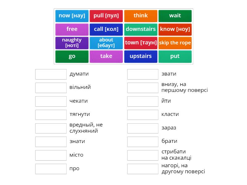 pull [пул] - тягнути, wait - чекати , take - брати, put - класти, call [кол] - звати , downstairs - внизу, на першому поверсі, upstairs - нагорі, на другому поверсі, free - вільний, skip the rope - стрибати на скакалці, know [ноу] - знати, think - думати, town [таун] - місто, naughty [ноті] - вредный, не слухняний, go - йти, now [нау] - зараз, about [ебаут] - про,