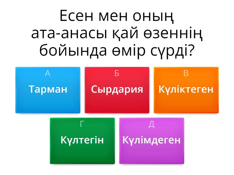 1) Есен мен оның ата-анасы қай өзеннің бойында өмір сүрді? a) Тарман b) Сырдария c) Күліктеген d) Күлтегін e) Күлімдеген 2) 180 теңгені Есен не үшін сұрады? a) Балық тазартқаны үшін b) Отын жинағаны үшін c) От жаққаны үшін d) Барлық жауап дұрыс e) Үй шаруашылығына көмектескені үшін 3) Анасы Есенге қалай жауап қайтарды a) a) Ешқандай жауап қайтарған жоқ b) b) Баласының тәсілін өзіне қолданды c) c) Есенге ақшасын берді d) d) Барлық жауап дұрыс 4) Жігіт әкесін қайда апарып тастайды? a) Өзенге b) Тауға c) Ауылға d) Шөл далаға 5) Жігіттің әкесі жүре аладыма? a) Жоқ b) Иә 6) Есеннің әкесі кім болып жұмыс істеді? a) a) Балықшы b) b) Бақташы c) c) Етікші d) d) Дұрыс жауап жоқ. 7) « ..... не істесең, ...... сол келеді...» Мақалды аяқта, бұл мақалды қай ертегіден естідіңіздер? a) b) Атаңа, алдына, «Әке қадірі» b) c) Әкеңе, алдыңа, «Әке қадірі» c) d) Атаңа, артына, «Ана қадірі» d) a) Анаңа, алдына, «Ана қадірі»