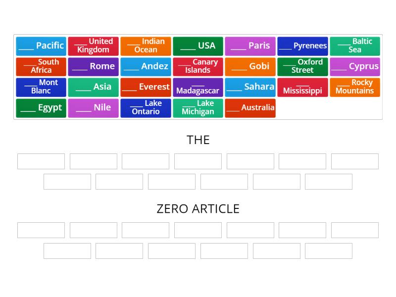 THE: ____ Mississippi, ____ Pacific, ____ Baltic Sea, ____ Rocky Mountains, ____ Andez, ____ Canary Islands, ____ USA, ____ United Kingdom, ____ Sahara, ____ Gobi, ____ Nile, ____ Indian Ocean, ____ Pyrenees , ZERO ARTICLE: ____ Egypt, ____ South Africa, ____ Australia, ____ Rome, ____ Oxford Street, ____ Mont Blanc , ____ Lake Ontario, ____ Cyprus, ____ Asia, ____ Everest, ____ Lake Michigan , ____ Madagascar , ____ Paris,