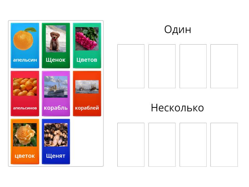 Один: Щенок, цветок, корабль , апельсин , Несколько: Щенят,  Цветов, кораблей, апельсинов ,