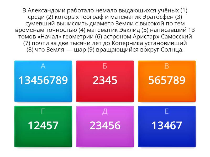 1) В Александрии работало немало выдающихся учёных (1) среди (2) которых географ и математик Эратосфен (3) сумевший вычислить диаметр Земли с высокой по тем временам точностью (4) математик Эвклид (5) написавший 13 томов «Начал» геометрии (6) астроном Аристарх Самосский (7) почти за две тысячи лет до Коперника установивший (8) что Земля  — шар (9) вращающийся вокруг Солнца. a) 13456789 b) 2345 c) 565789 d) 12457 e) 23456 f) 13467 2) Когда всматриваешься в группу «праведных жен»(1) идущих в рай(2) нарисованную на южном столпе(3) то особенно глубоко ощущаешь(4) замысел художника(5) верившего в то(6) что зло исчезнет(7) уступив в мире (8)место добру. a) 23456 b) 123567 c) 2345 d) 1567 e) 45789 f) 2457 3) Национальный театр драмы имени известного алтайского поэта Павла Кучияка (1) это главная культурная достопримечательность столицы Республики Алтай. Здание театра выполнено в стиле традиционного жилища коренных народов (2) благодаря чему (3) его четырёхгранную крышу (4) можно увидеть едва ли не из любой точки города. Помимо четырёхгранного конуса крыши (5) особое внимание привлекает гармоничное сочетание белого и голубого цветов. Это сочетание (6) одна из традиционных особенностей кочевого стиля. a) 13 b) 16 c) 23 d) 12 e) 34 f) 45 4)   РАСЦЕНИВАТЬ  — на конце приставки перед буквой, обозначающей глухой согласный звук, пишется буква С. a) верно b) неверно 5)   ПОДВЕДЕНЫ (итоги)  — в краткой форме имени прилагательного пишется столько же Н, сколько и в полной a) верно b) неверно 6) КОСИЧКИ  — написание безударной чередующейся гласной в корне слова определяется наличием суффикса -А-. a) верно b) неверно 7) РАССТИЛАТЬСЯ  — написание безударной чередующейся гласной в корне слова зависит от его лексического значения. a) верно b) неверно 8)  (решил много) ЗАДАЧ  — в форме множественного числа имени существительного 3-го склонения после шипящего буква Ь не пишется. a) верно b) неверно 9)   (говорил) ПО-АНГЛИЙСКИ  — наречие пишется через дефис, потому что оно образовано от основы имени прилагательного при помощи приставки ПО- и суффикса -И. a) верно b) неверно 10)  СЦЕПЛЕНИЕ  — на конце приставки перед буквой, обозначающей глухой согласный, пишется буква С. a) верно b) неверно