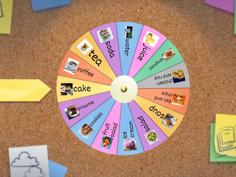 coffee, tea, soda, water, juice, spaghetti, chicken and rice, fish and chips, soup, salad, ice cream, fruit salad, cookies, brownie, cake.