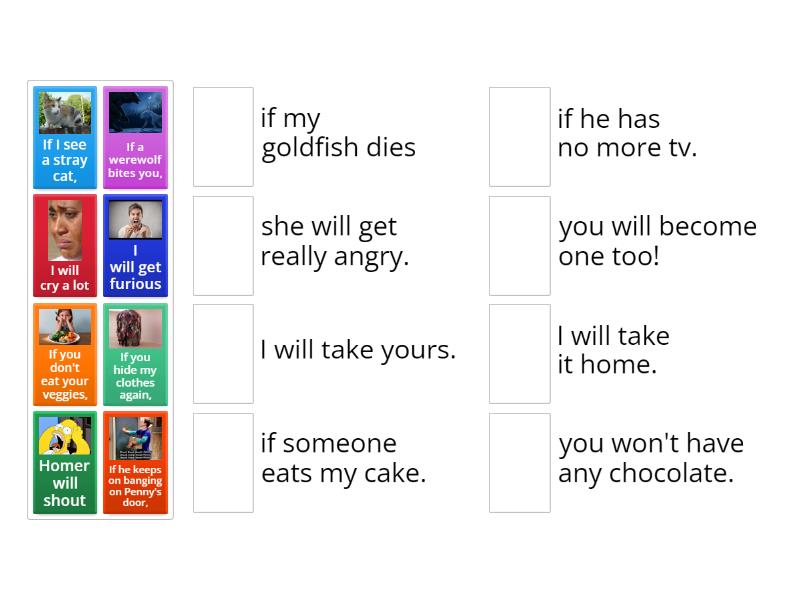 If you hide my clothes again, - I will take yours. , If I see a stray cat, - I will take it home. , Homer will shout  - if he has no more tv. , If he keeps on banging on Penny's door,  - she will get really angry., I will get furious - if someone eats my cake. , If you don't eat your veggies, - you won't have any chocolate. , I will cry a lot - if my goldfish dies, If a werewolf bites you, - you will become one too!,