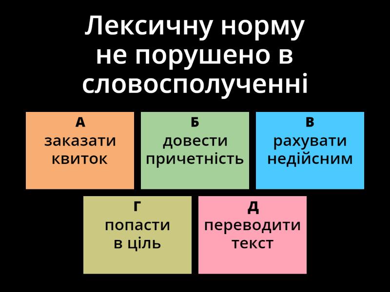 1) Лексичну норму не порушено в словосполученні a) заказати квиток b) довести причетність c) рахувати недійсним d) попасти в ціль e) переводити текст 2) Лексичну норму не порушено в словосполученні a) взяти участь b) привести до падіння виробництва c) мішати в роботі d) підводити підсумки e) присвоїти кошти 3) Лексичну норму не порушено в словосполученні a) мешканець України b) міжнародне положення c) підбивати підсумки d) провести міроприємство e) замісник директора 4) Лексичну норму не порушено в словосполученні a) виключення з правила b) поштовий перевод c) міжнародні стосунки d) свідоцтво очевидців e) ухвалити рішення 5) Лексичну норму не порушено в словосполученні a) нижня білизна b) гарно виглядати c) ввічливо поводитися d) взяти себе в руки 6) Помилково вжито слово в рядку a) ювілейні міроприємства b) парламентська республіка c) непримиренні опоненти d) прикордонна територія 7) Помилково вжито слово в рядку a) брати участь b) здавати іспит c) додати води d) завдати шкоди 8) Помилково вжито слово в рядку a) знаний у столиці b) бувший у користуванні c) охочий відвідати виставку d) прикрі помилки 9) Помилково вжито слово в рядку a) відхилити пропозицію b) давно знати друг друга c) передплатити дві газети d) довгостроковий проєкт 10) Помилково вжито слово в рядку a) винайняв квартиру в центрі b) запросив до вітальні c) розповів про відрядження d) приїхав вісім років назад 11) Помилково вжито слово в рядку a) зачинити кабінет фізики b) доводити складну теорему c) складати випускний іспит d) мішати проводити урок 12) Лексичну помилку допущено в рядку a) автобус на замовлення b) здобути поразку c) вимкнути електрику d) образив мимоволі