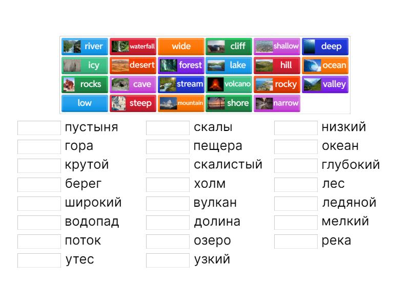 cave - пещера, cliff - утес, desert - пустыня, forest - лес, hill - холм, icy - ледяной, lake - озеро, low - низкий, mountain - гора, narrow - узкий, ocean - океан, river - река, rocks - скалы, rocky - скалистый, shallow - мелкий, shore - берег, steep - крутой, stream - поток, valley - долина, volcano - вулкан, waterfall - водопад, wide - широкий, deep - глубокий,