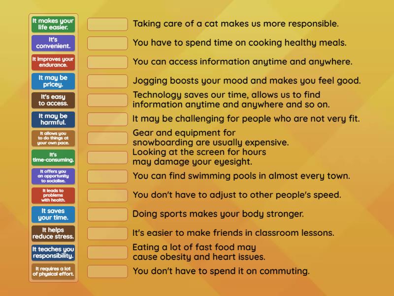 It's convenient. - You can access information anytime and anywhere. , It may be pricey. - Gear and equipment for snowboarding are usually expensive., It allows you to do things at your own pace.  - You don't have to adjust to other people's speed., It may be harmful. - Looking at the screen for hours may damage your eyesight., It leads to problems with health. - Eating a lot of fast food may cause obesity and heart issues., It makes your life easier.  - Technology saves our time, allows us to find information anytime and anywhere and so on., It saves your time.  - You don't have to spend it on commuting., It's time-consuming. - You have to spend time on cooking healthy meals., It helps reduce stress. - Jogging boosts your mood and makes you feel good., It requires a lot of physical effort. - It may be challenging for people who are not very fit., It offers you an opportunity to socialise. - It's easier to make friends in classroom lessons., It teaches you responsibility.  - Taking care of a cat makes us more responsible., It improves your endurance.  - Doing sports makes your body stronger. , It's easy to access. - You can find swimming pools in almost every town.,