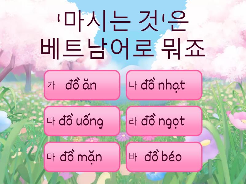 1) '마시는 것'은 베트남어로 뭐죠 a) đồ ăn b) đồ nhạt c) đồ uống d) đồ ngọt e) đồ mặn f) đồ béo 2) tớ/mượn/ quyển sách/ này/ nhé?/cho를 사용하여 옳은 문장은? a) tớ mượn quyển sách này nhé cho? b) cho mượn tớ quyển sách này nhé? c) cho tớ mượn quyển sách này nhé? d) mượn tớ quyển sách này cho nhé? 3) '우리에게 메뉴를 주세요.'는 베트남어로 어떻게 말해요? a) Cho chị thực đơn. b) Thực đơn ở đâu? c) Thực đơn chị cho d) Cho chị đơn thực. 4) 아래의 단어를 선택하여 'Tôi còn đói. Tôi muốn gọi .... đồ ăn.' 의 빈칸을 채우세요. a) nữa b) thêm c) chưa d) rồi e) đã f) ngon