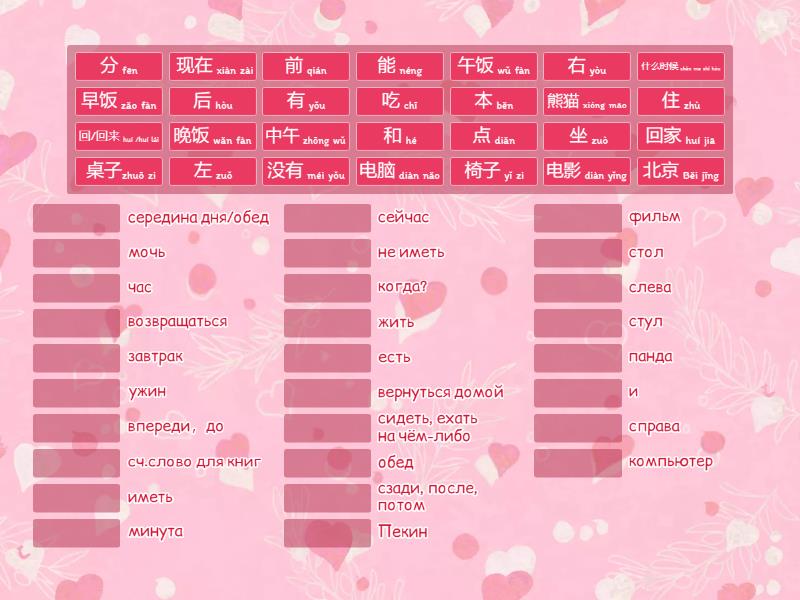 桌子zhuō zi   - стол, 电脑 diàn nǎo - компьютер, 和 hé - и, 本 běn - сч.слово для книг, 有 yǒu - иметь, 没有 méi yǒu - не иметь, 坐 zuò   - сидеть, ехать на чём-либо, 能 néng - мочь, 熊猫 xióng māo - панда, 椅子 yǐ zi - стул, 前 qián - впереди,до, 后 hòu - сзади, после, потом, 右 yòu - справа, 左 zuǒ - слева, 现在 xiàn zài   - сейчас, 点 diǎn - час, 分 fēn - минута, 北京 Běi jīng - Пекин, 电影 diàn yǐng - фильм, 住 zhù - жить, 回/回来 huí /huí lái - возвращаться, 回家 huí jiā - вернуться домой, 什么时候 shén me shí hòu - когда?, 吃 chī - есть, 早饭 zǎo fàn - завтрак, 午饭 wǔ fàn - обед, 晚饭 wǎn fàn - ужин, 中午 zhōng wǔ - середина дня/обед,
