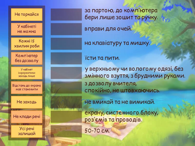 У кабінет інформатики заходь лише - з дозволу вчителя, спокійно, не штовхаючись., Не заходь - у верхньому чи вологому одязі, без змінного взуття, з брудними руками., У кабінеті не можна - їсти та пити., Усі речі залишай - за партою, до комп’ютера бери лише зошит та ручку., Комп’ютер без дозволу - не вмикай та не вимикай., Не торкайся - екрану, системного блоку, роз’ємів та проводів., Не клади речі - на клавіатуру та мишку., Відстань до екрана має становити - 50-70 см., Кожні 15 хвилин роби - вправи для очей.,