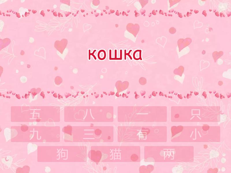 猫 - кошка, 狗 - собака, 只 - счетное слово животные, 一 - один, 两 - два (счетное), 有 - иметь, 小 - маленький , 五 - 5, 三 - 3, 九 - 9, 八 - 8,