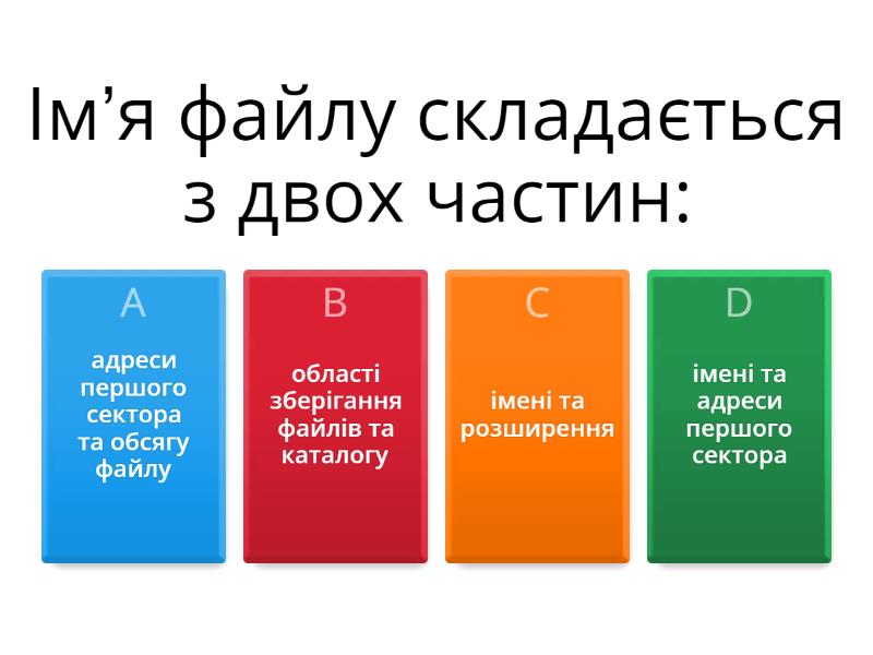 1) Ім’я файлу складається з двох частин: a) адреси першого сектора та обсягу файлу b) області зберігання файлів та каталогу c) імені та розширення d) імені та адреси першого сектора 2) Що таке ярлик? a) посилання на інший об'єкт на цьому самому комп'ютері або в мережі b) прихований файл c) посилання на об'єкт що був видалений d) комп'ютерна програма 3) Windows - це операційна система для ... a) мобільних телефонів b) персональних комп'ютерів c) системних блоків d) суперкомп'ютерів 4) На що вказує розширення в імені файла? a) тип файла b) ім'я файла. c) розмір файла. d) розміщення файла 5) Що не може зберігатися в файлах? a) Музика b) Зображення c) Фото d) Відео e) Їжа f) Мультфільми 6) Для надання файлам імені існує таке правило: a) можна додавати символи ", ( ?- b) не можна додавати символи \ * / : ? ” < > | c) можна писати все 7) Обери не правильно підписаний файл. a) Мій край.pptx b) **Світлини**.jpg c) Інформатика.docx d) Приклади+задачі.txt 8) Що таке файл? a) набір даних певного типу, що розміщується на носії даних і має ім'я b) алгоритм, призначений для виконання комп'ютером c) комплекс програм d) засіб забезпечення обміну даними між двома об'єктами 9) Файли та папки НЕ можуть зберігатись ... a) в сейфі b) на жорсткому диску c) на робочому столі d) на оптичному диску e) на флешці 10) Папку, розташовану всередині іншої папки називають ... a) вкладеною b) поточною c) головною 11) При видаленні ярлика... a) відповідний йому об'єкт видаляється b) відповідний йому об'єкт не видаляється c) ярлик не можна видалити 12) Виберіть правильне твердження: a) Папки можуть не мати імені. b) Кожна папка має своє ім’я. c) В одній папці можуть міститися один, жодного або багато файлів. d) Папки можуть бути розміщені у файлах