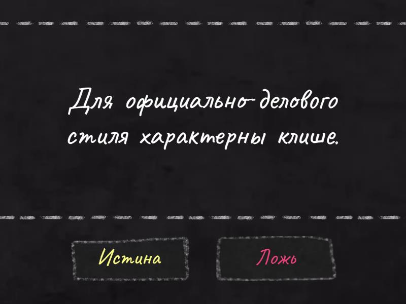 Истина: Для официально-делового стиля характерны клише. , В разговорном стиле могут использоваться междометия. , Для научного стиля характерно использование цитат, ссылок на источник информации и т.д., Для привлечения внимания автор текста публицистического стиля прибегает к риторическим вопросам., Объективность — черта научного стиля., В художественном стиле могут использоваться слова с уменьшительными суффиксами. , Интервью — жанр публицистического стиля., Основой текста официально-делового стиля является письменная речь., Для синтаксиса текстов научного стиля характерно использование безличных предложений., Ложь: Для разговорного стиля характерна метафоричность. , Для научного стиля характерны неполные предложения., Для художественного стиля характерно использование глаголов во вневременном значении. , Для публицистического стиля характерна сбивчивость речи., Цель текста официально-делового стиля — убеждение., Активное использование парцелляции — черта официально-делового стиля., Для текста публицистического стиля характерна неподготовленная диалогическая речь., Цель текста публицистического стиля — представить в образной форме проблему с целью эстетического воздействия.,