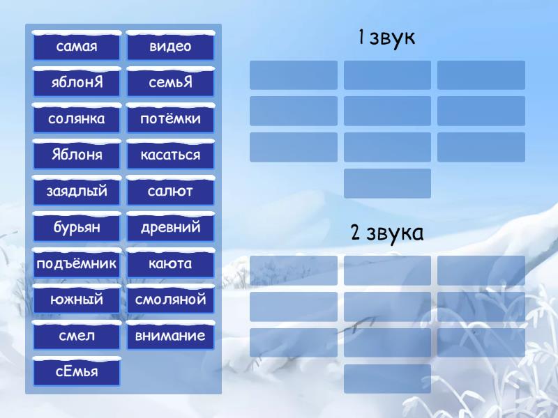 1 звук: потёмки, салют, яблонЯ, солянка, касаться, видео, древний, смоляной, сЕмья, смел, 2 звука: подъёмник, Яблоня, заядлый, самая, южный, семьЯ, внимание, каюта, бурьян,