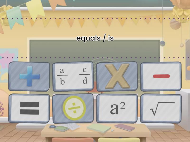 equals / is, plus, minus, times, divided by, a over b / c over d, the square root of, squared,