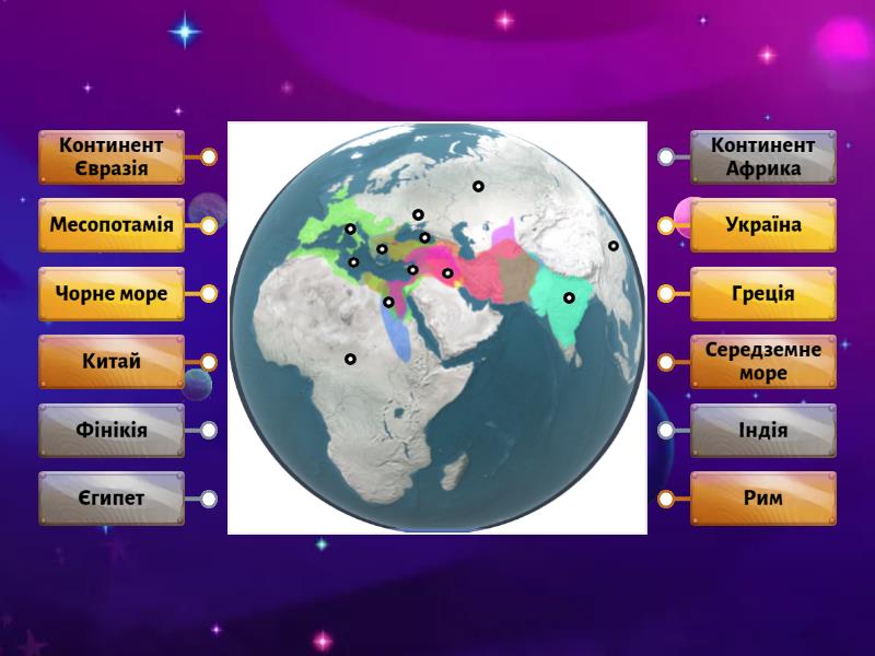Греція, Єгипет, Рим, Месопотамія, Індія, Китай, Україна, Фінікія, Середземне море, Чорне море, Континент Африка, Континент Євразія.