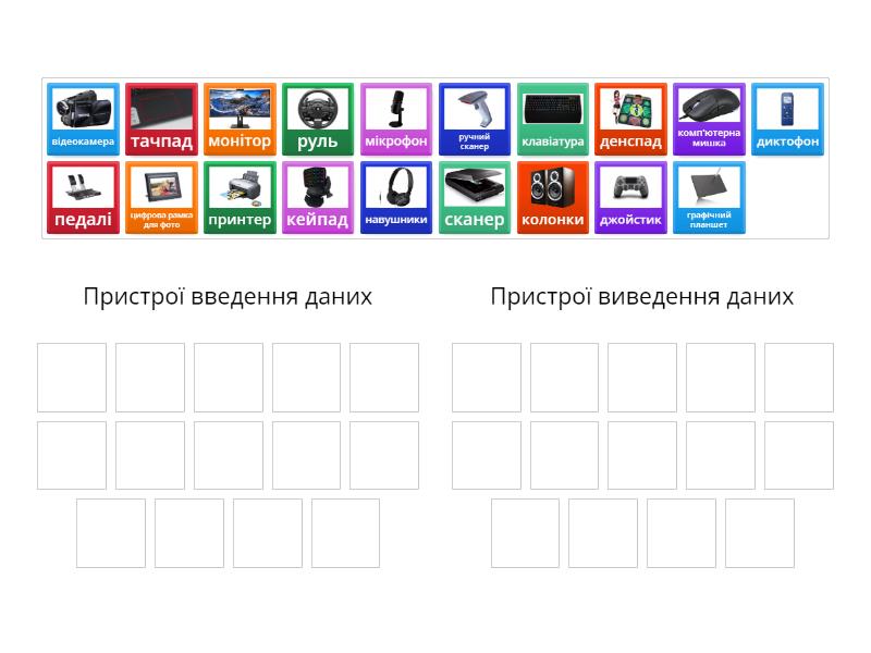 Пристрої введення даних: клавіатура, комп'ютерна мишка, мікрофон, диктофон, відеокамера, джойстик, тачпад, руль, педалі, кейпад, денспад, графічний планшет, ручний сканер, сканер, Пристрої виведення даних: монітор, колонки, принтер, навушники, цифрова рамка для фото,