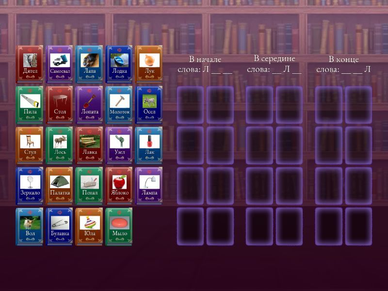 В начале слова: Л __ __: Лампа, Лак, Лапа, Лук, Лось, Лавка, Лодка, Лопата, В середине слова: __ Л __: Пила, Юла, Палатка, Яблоко, Мыло, Булавка, Зеркало, Молоток, В конце слова: __ __ Л: Дятел, Стол, Стул, Вол, Пенал, Узел, Осел, Самосвал,