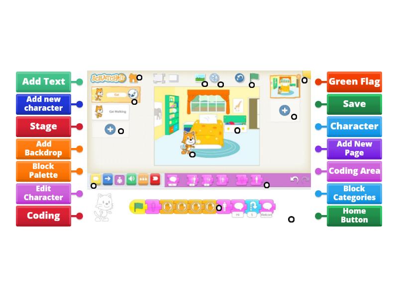 Character, Stage, Add Backdrop, Home Button, Edit Character, Add new character, Add Text, Green Flag, Add New Page, Block Categories, Coding , Block Palette, Save, Coding Area.