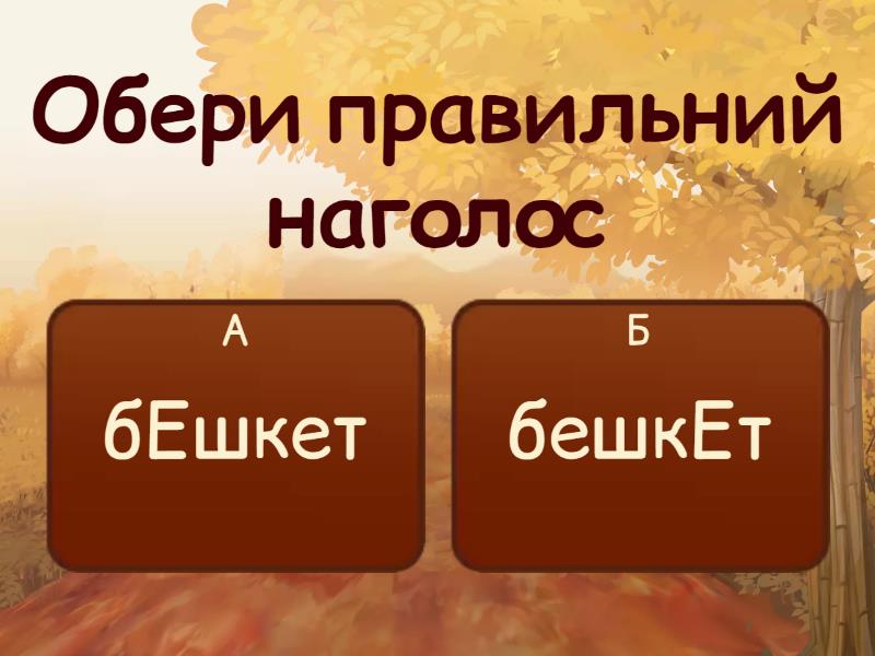 1) Обери правильний наголос a) бЕшкет b) бешкЕт 2) Обери правильний наголос a) вИразний b) вирАзний 3) Обери правильний наголос a) горошИна b) горОшина 4) Обери правильний наголос a) зраннЯ b) зрАння 5) Обери правильний наголос a) кОлесо b) колЕсо 6) Обери правильний наголос a) кроЇти b) крОїти 7) Обери правильний наголос a) чорнослИв b) чорнОслив 8) Обери правильний наголос a) фОльга b) фольгА 9) Обери правильний наголос a) начИнка b) нАчинка 10) Обери правильний наголос a) уподОбання b) уподобАння 11) Обери правильний наголос a) фАховий b) фаховИй 12) Обери правильний наголос a) Олень b) олЕнь 13) Обери правильний наголос a) агронОмія b) агрономІя 14) Обери правильний наголос a) Аркушик b) аркУшик 15) Обери правильний наголос a) багаторазОвий b) багаторАзовий 16) Обери правильний наголос a) безпрИнципний b) безпринцИпний 17) Обери правильний наголос a) благовІст b) блАговіст 18) Обери правильний наголос a) близькИй b) блИзький 19) Обери правильний наголос a) болОтистий b) болотИстий 20) Обери правильний наголос a) борОдавка b) бородАвка 21) Обери правильний наголос a) босОніж b) босонІж 22) Обери правильний наголос a) боЯзнь b) бОязнь 23) Обери правильний наголос a) бурштИновий b) бурштинОвий