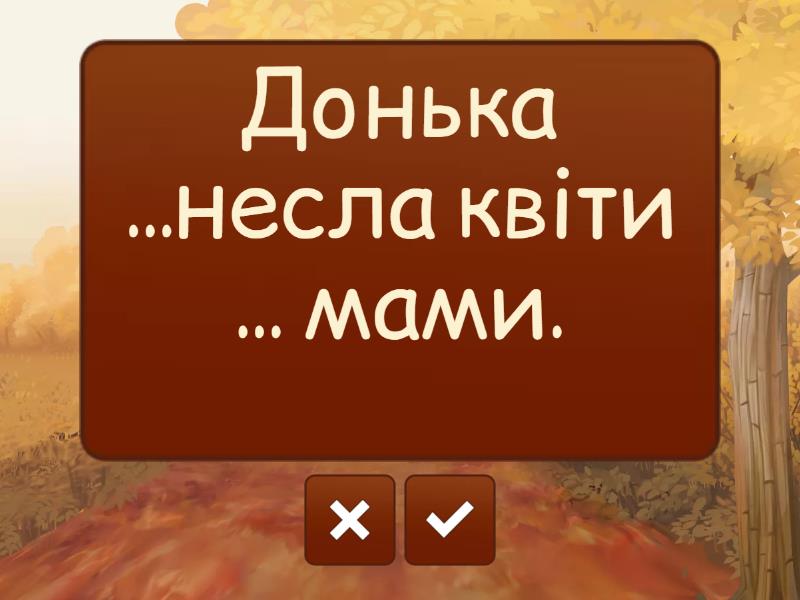 Кіт ...ліз ... дерево. - Кіт заліз на дерево., Птахи ...летіли ... південь. - Птахи відлетіли на південь., Донька ...несла квіти ... мами. - Донька принесла квіти для мами., Собака ...стрибнув ... паркан. - Собака перестрибнув через паркан., Ми ...їхали ... лісу. - Ми доїхали до лісу.,