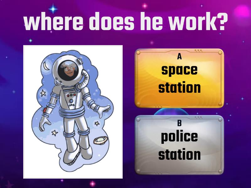 1) where does he work? a) space station b) police station   2) who is he ? a) doctor b) cook 3) Where do they work? a) bank b) restaurant 4) where dose she work? a) school b) hospital 5) What do you do ? a) I put out the fire b) I fly planes  6) what dose she do? a) she helps sick people. b) she teaches  7) where does the scientist work? a) school b) laboratory. 8) where does the architect work? a) an office b) hospital