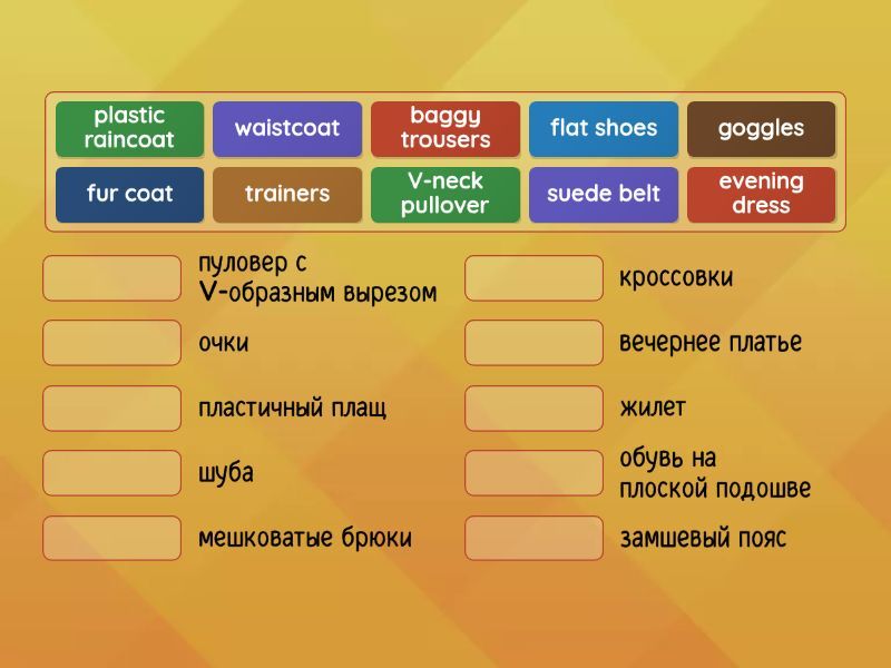 cotton T-shirt - хлопковая футболка, denim dress - джинсовое платье, short-sleeved shirt - рубашка с короткими рукавами, long-sleeved cardigan - кардиган с длинными рукавами, dinner jacket - смокинг, V-neck pullover - пуловер с V-образным вырезом, spotted tie - галстук в горошек, fur coat - шуба, baggy trousers - мешковатые брюки, polo neck jumper - водолазка, high-heeled shoes - туфли на высоком каблуке, flat shoes - обувь на плоской подошве, plain trousers - простые брюки, checked skirt - клетчатая юбка, leggings - леггинсы, striped shorts - полосатые шорты, waistcoat - жилет, suede belt - замшевый пояс, straw hat - соломенная шляпа, evening dress - вечернее платье, silk scarf - шелковый шарф, leather skirt - кожаная юбка, woolen jumper - шерстяной джемпер, plastic raincoat - пластичный плащ, goggles - очки, flippers - ласты, boots - сапоги, gloves - перчатки, trainers - кроссовки, sandals - сандалии,