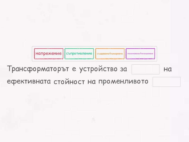 Трансформаторът е устройство за ____ на ефективната стойност на променливото ____ Всеки трансформатор има две ____ навити около сърцевина от феромагнитен материал. Намотката, свързана с източника на напрежение, наричаме ____ , а другата - ____ Между броя на навивките и напрежението съществува ____ Зависимостта е: ____ Ако N1< N2 трансформатора се нарича ____ Ако N1> N2 - ____