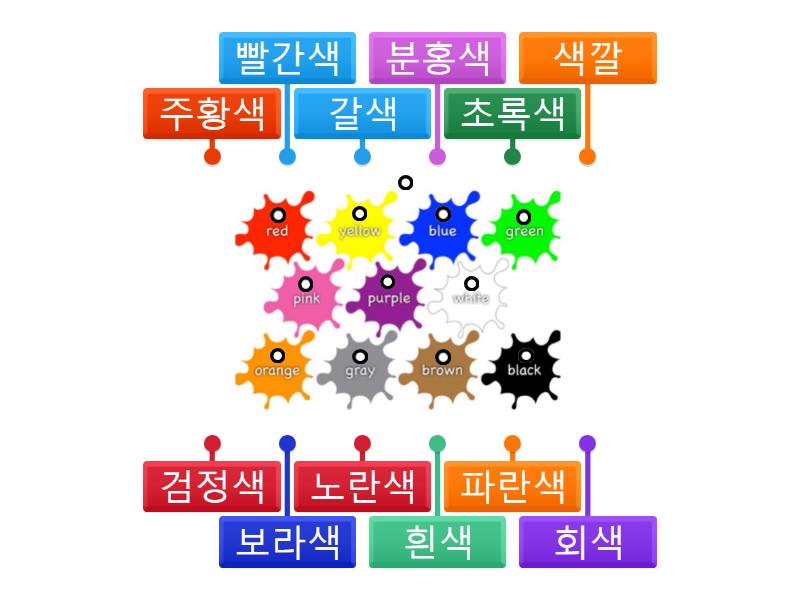 빨간색, 노란색, 파란색, 초록색, 분홍색, 보라색, 흰색, 주황색, 회색, 갈색, 검정색, 색깔.