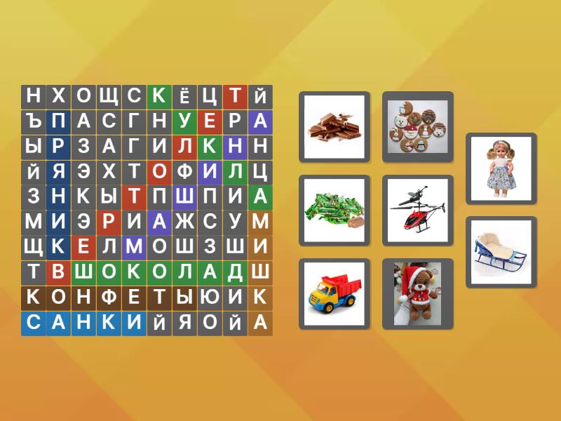 кукла, машина, вертолет, санки, конфеты, пряник, мишка, шоколад,
