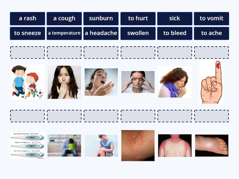 a cough, a headache, a rash, a temperature, sunburn, sick, to vomit, to sneeze, swollen, to hurt, to ache, to bleed,