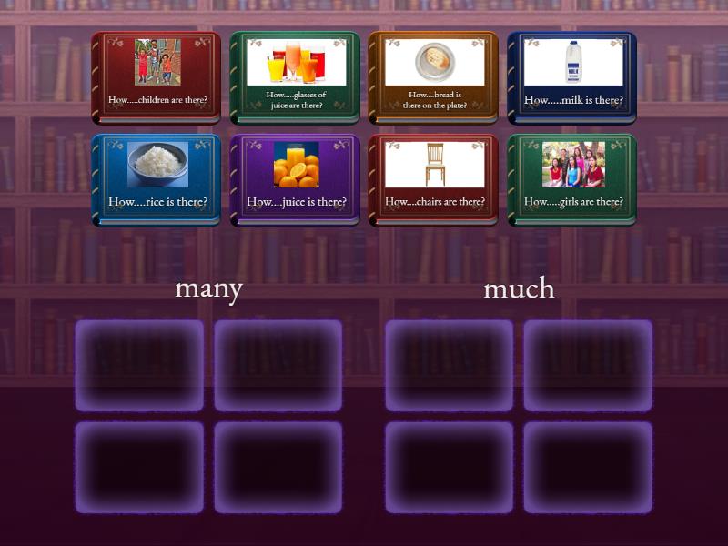 many: How.....glasses of juice are there?, How.....girls are there?, How.....children are there?, How....chairs are there?, much: How.....milk is there?, How....rice is there?, How....juice is there?, How....bread is there on the plate?,