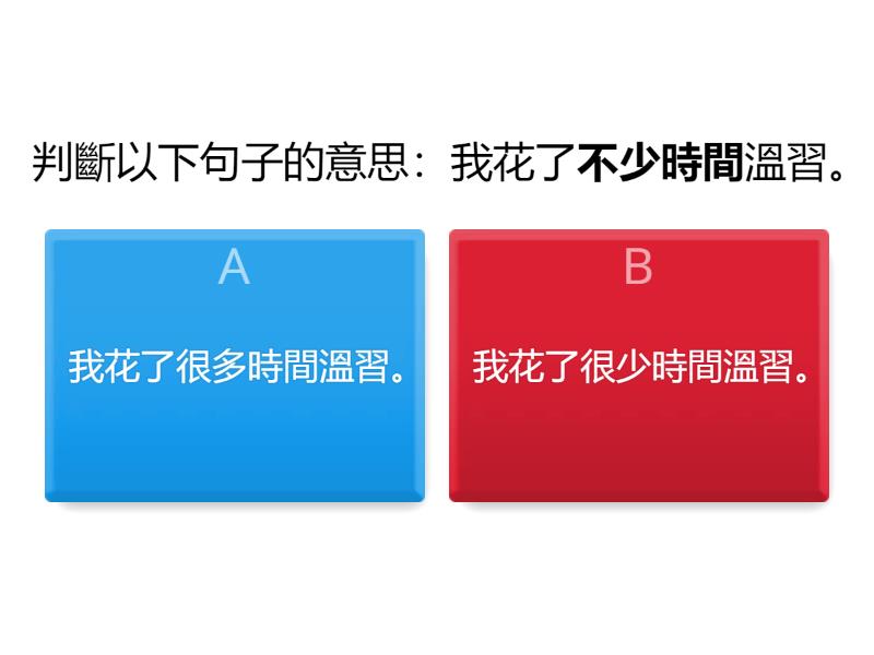1) 判斷以下句子的意思:我花了不少時間溫習。 a) 我花了很多時間溫習。 b) 我花了很少時間溫習。 2) 判斷以下句子的意思:這條題目一點也不複雜。 a) 這條題目很簡單。 b) 這條題目很複雜。 3) 判斷以下句子的意思:這段舞蹈不輕鬆。 a) 這段舞蹈很輕鬆。 b) 這段舞蹈很困難。 4) 判斷以下句子的意思:弟弟不喜歡上足球班。 a) 弟弟迷戀上足球班。 b) 弟弟討厭上足球班。 5) 判斷以下句子的意思:這件二手衣服不是很新。 a) 這件二手衣服很新。 b) 這件二手衣服很舊。 6) 判斷以下句子的意思:媽媽每天都要做家務,她不辛苦嗎? a) 媽媽很辛苦。 b) 媽媽不辛苦。