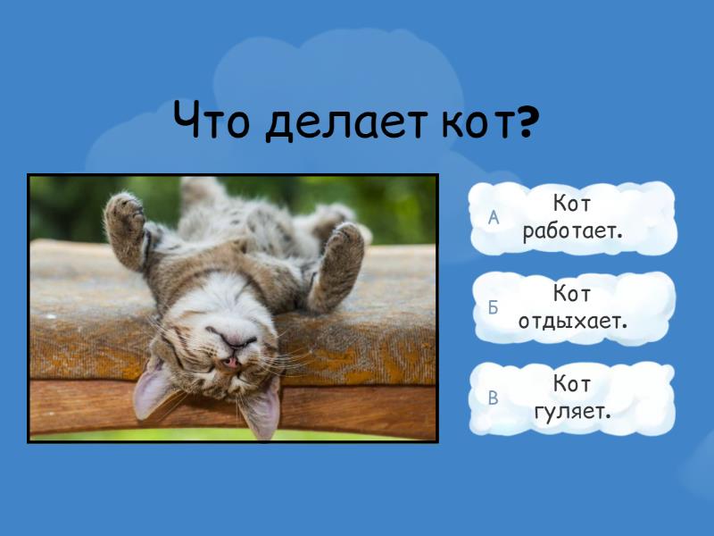 1) Что делает кот? a) Кот работает. b) Кот отдыхает. c) Кот гуляет. 2) Что делает Антон? a) Антон читает. b) Антон обедает. c) Антон работает. 3) Что делают бабушка и дедушка? a) Бабушка и дедушка играют. b) Бабушка и дедушка работают. c) Бабушка и дедушка гуляют. 4) Что делает мальчик? a) Мальчик обедает. b) Мальчик думает. c) Мальчик отдыхает. 5) Что делает собака? a) Собака играет. b) Собака читает. c) Собака гуляет. 6) Что делает девушка? a) Девушка думает. b) Девушка ужинает. c) Девушка работает. 7) Что делают дети? a) Дети читает. b) Дети читаем. c) Дети читают. 8) Что делает собака? a) Собака играете. b) Собака играет. c) Собака играешь. 9) Что делает кошка? a) Кошка гуляем. b) Кошка гуляют. c) Кошка гуляет. 10) Что ты делаешь? a) Я обедаю. b) Я обедает. c) Я обедаем. 11) Что вы делаете? a) Мы работают. b) Мы работаете. c) Мы работаем.
