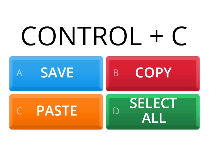 1) CONTROL + C a) SAVE b) COPY c) PASTE d) SELECT ALL 2) CONTROL + T a) CREATE A TABLE b) SELECT TOOLS c) SAVE d) PRINT 3) CONTROL + V a) CUT b) COPY c) PASTE d) PRINT 4) CONTROL + A a) SELECT ALL b) DELETE c) SAVE d) INSERT PICTURE 5) CONTROL + U a) SAVE b) UNDO c) PRINT d) UNDERLINE 6) CONTROL + i a) BOLD b) SAVE c) COPY d) ITALICS  7) CONTROL + S a) SAVE b) PRINT c) SEND d) SPELLING 8) CONTROL + B a) CUT b) SAVE c) BOLD d) DELETE 9) CONTROL + X a) CUT b) PASTE c) SAVE d) DELETE 10) CONROL + Z a) SELECT b) ZOOM c) PRINT d) UNDO