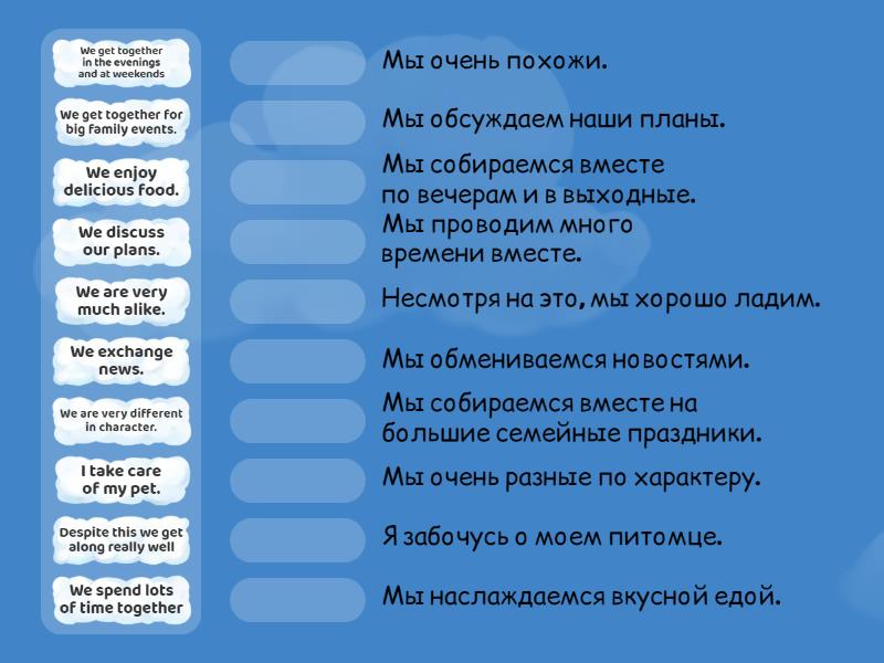 We spend lots of time together - Мы проводим много времени вместе., We get together in the evenings and at weekends - Мы собираемся вместе по вечерам и в выходные., We get together for big family events. - Мы собираемся вместе на большие семейные праздники., We are very much alike. - Мы очень похожи., We are very different in character. - Мы очень разные по характеру., Despite this we get along really well - Несмотря на это, мы хорошо ладим., We exchange news. - Мы обмениваемся новостями., We discuss our plans. - Мы обсуждаем наши планы., We enjoy delicious food. - Мы наслаждаемся вкусной едой., I take care of my pet. - Я забочусь о моем питомце.,