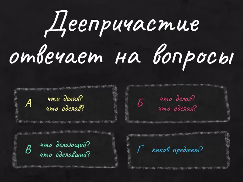 1) Деепричастие отвечает на вопросы a) что делая? что сделав? b) что делал? что сделал? c) что делающий? что сделавший? d) каков предмет? 2) Укажите, признаки какой части речи имеет деепричастие a) глагола и прилагательного b) существительного c) глагола и наречия d) наречия и прилагательного 3) Какого грамматического признака нет у деепричастия? a) возвратность b) неизменяемость c) вид d) время 4) Укажите предложение, в котором есть деепричастие совершенного вида a) Он рассказывал все это улыбаясь. b) Рассказав всю эту историю, Пашка стер пот со лба. c) Придя домой, я тут же сел за уроки. d) Находясь в лесу, слушайте пение птиц. 5) Укажите неверное утверждение. В предложении: Мама сидела, откинувшись на спинку стула. a) деепричастие откинувшись образовано от глагола откинуться b) деепричастие в предложении является сказуемым c) откинувшись — деепричастие d) деепричастие совершенного вида 6) Укажите неверное утверждение a) деепричастия не изменяются b) деепричастие может иметь при себе зависимые слова c) деепричастие в предложении являются обстоятельством d) деепричастный оборот выделяется запятыми, если стоит после определяемого слова
