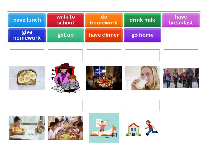 get up , drink milk, have lunch, have breakfast, have dinner, go home, give homework, walk to school, do homework,