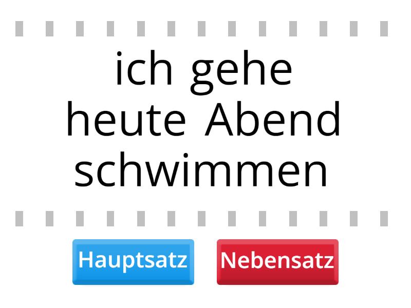 Hauptsatz: ich gehe heute Abend schwimmen, ich gehe jeden Tag zur Schule, du hast heute Geburtstag, du bekommst viele Geschenke, er ist krank, er schläft sehr viel, sie spielt mit ihren Freunden, sie kann sehr gut singen, es freut mich, wir gehen ins Kino, wir reisen nach Italien , Ihr trainiert jeden Tag , ihr seid zu meiner Party eingeladen, sie sprechen Japanisch, sie spielen viele Instrumente , Nebensatz: weil es warm ist, weil ich viel lernen will, bevor ich schlafen gehe, weil er müde ist, bis sie schlafen gehen muss, wenn sie viel übt, dass es dir gut geht, dass ich eine Katze habe, dass das Wetter schön ist , weil wir gerne Filme sehen, weil wir das Kolosseum sehen wollen, damit ihr einen Marathon laufen könnt, weil wir Freunde sind , weil sie aus Japan kommen, wenn wir nach Hause komme,