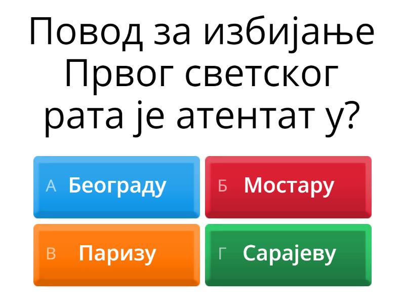 1) Повод за избијање Првог светског рата је атентат у? a) Београду b) Мостару c) Паризу d) Сарајеву 2) Атентат у Сарајеву је извршио? a) Гаврило Принцип b) Степа Степановић c) Црвени барон d) Анте Павелић 3) Атентат у Сарајеву је био на који празник? a) Божић b) Цвети c) Сретење d) Видовдан 4) У Првом светском рату су ратовале Централне силе и силе? a) Брикса b) Запада c) Истока d) Антанте 5) Избаци уљеза међу централним силама? a) Аустругарска b) Немачка c) Румунија d) Османско царство- Турска 6) Избаци уљеза међу силама антанте? a) Француска b) Велика Британија c) Србија d) Бугарска 7) Која држава је закаснила у расподели колонија? a) Велика Британија b) Француска c) Немачка d) Шпанија 8) У Првом светском рату је Италија била на страни Србије? a) ТАЧНО b) НЕТАЧНО 9) Прве велике српске победе 1914. године су биле где? a) Цер b) Колубара c) Кајмакчалан d) Мојковац e) Битољ 10) Који фронт је отворен у Грчкој 1915. године? a) Балкански b) Критски c) Солунски d) Крфски 11) Како се звао српски краљ у периоду Првог светског рата? a) Петар b) Александар c) Милан d) Милош 12) Током 1914. Французи су успели да одбране Париз у бици на реци? a) Марни b) Сени c) По d) Тибар 13) Крвава битка код града Вердена се 1916. године водила између Француза и? a) Немаца b) Аустријанаца c) Бугара 14) У бици на реци Соми је први пут употребљено које наоружање? a) Тенк b) Бомба c) Бојни отров d) Калашњиков 15) Први светски рат се завршио 11. новембра капитулацијом које државе? a) Немачке b) Бугарске c) Аустроугарске d) Швајцарске 16) Пре Немачке капитулирала је? a) Аустроугарска b) Француска c) Румунија d) Велика Британија 17) Први светски рат је завршен које године? a) 1916. b) 1915 c) 1920, d) 1918. 18) Први светски рат је завршен победом? a) антанте b) централних сила 19) Италија је ушла у рат настрани антанте зато што јој је обећана која територија? a) Далмација b) Славонија c) Срем d) Косово 20) Бугарска је у Првом светском рату била на страни? a) антанте b) централних сила 21) САД су биле на страни? a) антанте b) централних сила 22) САД су ушле у Први светски рат због? a) кредита b) напада Јапана на Перл Харбур c) атентата у Сарајеву 23) Ултиматум је? a) Крајњи рок за испуњавање захтева b) молба c) највиши правни акт 24) Мобилизација је? a) војна обавеза b) доктрина c) помиловање 25) Гаврило Принцип је био припадник које организације? a) Млада Босна b) Јеховини сведоци c) Млада Србија 26) Аустроугарска је обрајвила рат Србији? a) 28. маја b) 28. јула c) 4. јула d) 2. јула 27) Командант аустругарских снага приликом напада на Србију 1914. био је? a) Оскар Поћорек b) Лајош Кошут c) Август Макензи 28) Врховни командант српске војке био је? a) регент Александар Карађорђевић b) Момчило Гаврић c) Петар Живоковић 29) Прва савезничка победа била је у августу 1914.? a) верденска битка b) церска битка c) битка на Соми 30) Током церске битке истакао се српски генерал? a) Степа Степановић b) Петар Бојовић c) Милан Недић d) Живојин Мишић 31) Новембра идецембра 1914. Срби су водили коју битку a) на Кајмакчалану b) код Битоља c) колубарску битку d) церску битку 32) Током колубарске битке истакао се српски генерал? a) Степа Степановић b) Живојин Мишић c) Петар Бојовић d) Милан Недић 33) Пошто Аустроугарска није могла сама да савлада Србију 1915. године нападају још Немачка и ? a) Бугарска b) Румунија c) Италија d) Белгија 34) Најодликованија жена војник на свету, Српкиња, борила се у Балканским и у Првом светском рату? a) Милунка Савић b) Јованка Савић c) Светлана Јовановић 35) Српска сликарка, стра