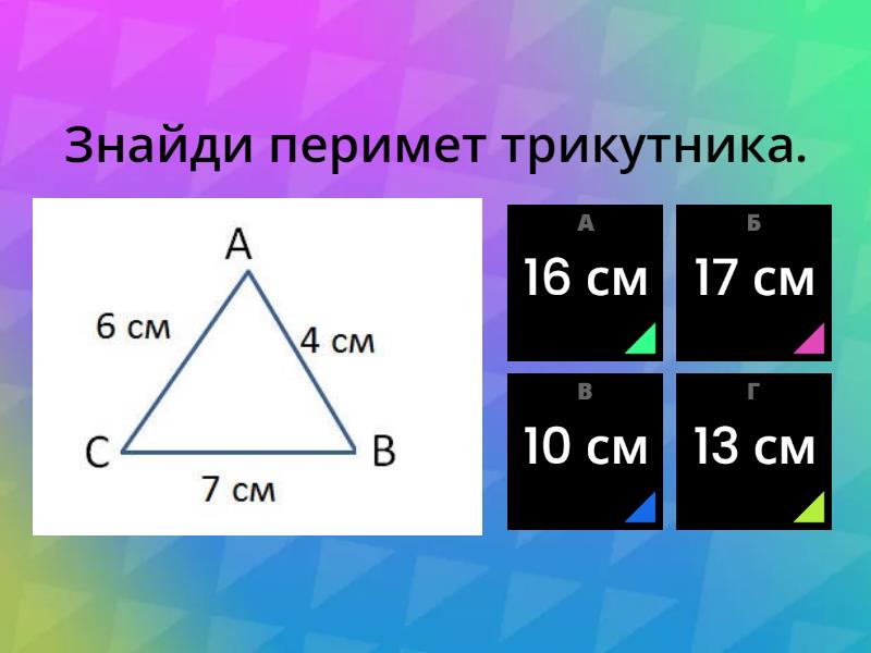 1) Знайди перимет трикутника. a) 16 см b) 17 см c) 10 см d) 13 см 2) Знайди перимет чотирикутника. a) 15 см b) 10 см c) 5 см d) 14 см 3) Знайди перимет прямокутника. a) 20 см b) 14 см c) 18 см d) 28 см 4) Знайди перимет квадрата. a) 22 см b) 24 см c) 12 см d) 6 см 5) Знайди перимет прямокутника. a) 16 см b) 5 см c) 3 см d) 8 см 6) Знайди перимет п'ятикутника. a) 5 см b) 10 см c) 14 см d) 7 см 7) Знайди перимет квадрата. a) 10 см b) 15 см c) 20 см d) 25 см 8) Знайди перимет прямокутника. a) 16 см b) 8 см c) 5 см d) 3 см