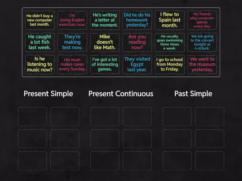 Present Simple: I've got a lot of interesting games., I go to school from Monday to Friday., My friends play computer games every day., Mike doesn't like Math., He usually goes swimming three times a week., His mum makes cakes every Sunday., Present Continuous: I'm doing English exercises now., He's writing a letter at the moment., We are going to the concert tonight at 6 o'clock., They're making test now., Are you reading now?, Is he listening to music now?, Past Simple: We went to the museum yesterday., He didn't buy a new computer last month., They visited Egypt last year., Did he do his homework yesterday?, He caught a lot fish last week., I flew to Spain last month.,