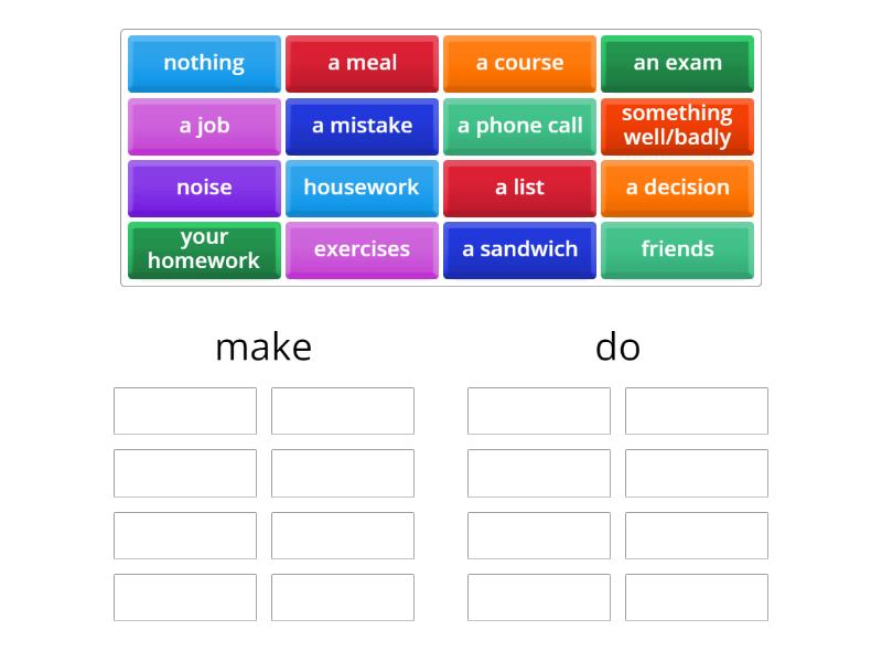 make: noise, a decision, a list, a mistake, a sandwich, a phone call, friends, a meal, do: exercises, something well/badly, your homework, a course, nothing, an exam, a job, housework,
