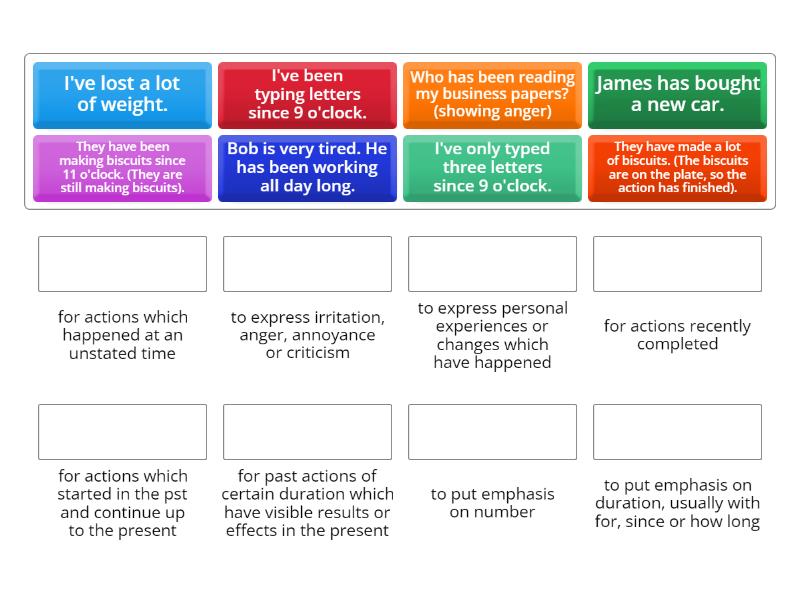 I've been typing letters since 9 o'clock. - to put emphasis on duration, usually with for, since or how long, James has bought a new car. - for actions which happened at an unstated time, They have made a lot of biscuits. (The biscuits are on the plate, so the action has finished). - for actions recently completed, I've only typed three letters since 9 o'clock. - to put emphasis on number, I've lost a lot of weight. - to express personal experiences or changes which have happened, They have been making biscuits since 11 o'clock. (They are still making biscuits). - for actions which started in the pst and continue up to the present, Who has been reading my business papers? (showing anger) - to express irritation, anger, annoyance or criticism, Bob is very tired. He has been working all day long. - for past actions of certain duration which have visible results or effects in the present ,