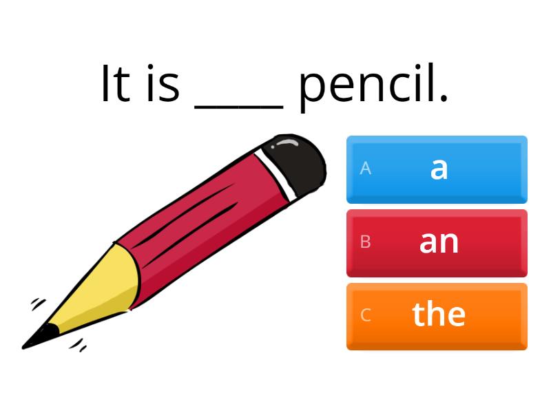 1) It is ____ pencil. a) a b) an c) the 2) They are ____ elephants. a) -- b) an c) the 3) It is ____ elephant. a) a b) an c) the 4) I have got a cat. ______ cat is grey. a) a b) an c) the 5) I have got ____ notebook. a) a b) an c) the 6) This is a book. Open _____ book. a) a b) -- c) the 7) I've got ____ apples. a) -- b) an c) the 8) I see a dog. _____ dog is white. a) a b) -- c) the 9) I have got a rabbit. _____ rabbit can jump. a) a b) an c) the 10) They are _____ carrots. a) a b) -- c) the