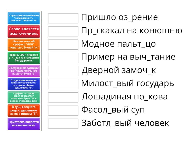 В безударном суффиксе "ЕВ" прилагательного пишется буква "Е" - Фасол_вый суп, Неизменяемый суффикс "ЛИВ" пишется с буквой "И" - Заботл_вый человек, Слово является исключением. - Милост_вый государь, Корень "ЗАР" пишется с "А", так как находится без ударения. - Пришло оз_рение, Приставка является неизменяемой. - Лошадиная по_кова, Суффикс "А" после корня определяет написание буквы "И" в корнях с чередованием. - Пример на выч_тание, В сущ. среднего рода с ударением на ок-е пишем "Е". - Модное пальт_цо, В родительном падеже гласная утрачивается, поэтому в суффтксе сущ. пишем "Е". - Дверной замоч_к, В приставке со значением "завершенность действия" пишется "И" - Пр_скакал на конюшню,
