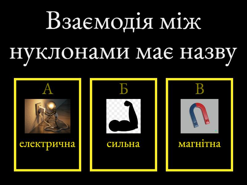 1) Явища радіоактивності відкрив a) Кюрі b) Беккерель c) Резерфор d) Максвелл 2) Взаємодія між нуклонами має назву a) електрична b) сильна c) магнітна 3) Ядра різної маси, у яких однакове зарядове число, мають назву a) ізомери b) полімери c) ізотопи 4) Яка з нижче наведених частинокнайменша? a) Атом b) Молекула c) Немає правильної відповіді 5) Хто першим побачив дивнийрух частин? a) Ейнштейн b) Роберт Браун c) Ян Інгенхауз d) Ньютон 6) чого складається атом? a) Електрони, ядро b) Нейтрони, електрони, протони, молекули. c) Нейтрони, електрони, протони, ядро 7) Зараз в Україні діють ...... АЕС a) 2 b) 7 c) 5 d) 9 e) 8 f) 4 8) Українська АЕС вважається найбільшою в Європі і 6 у світі. Яка це станція ? a) Рівненська b) Запорізька c) Хмельницька d) Південноукраїнська 9) У якому році сталася трагедія на Чорнобильській АЕС ? a) 1990 р. b) 2001 р. c) 1976 р. d) 1986 р. 10) Виберіть АЕС, які недобудовані a) Хмельницька b) Кримська c) Чигиринська d) Рівненська e) Запорізька f) Одеська